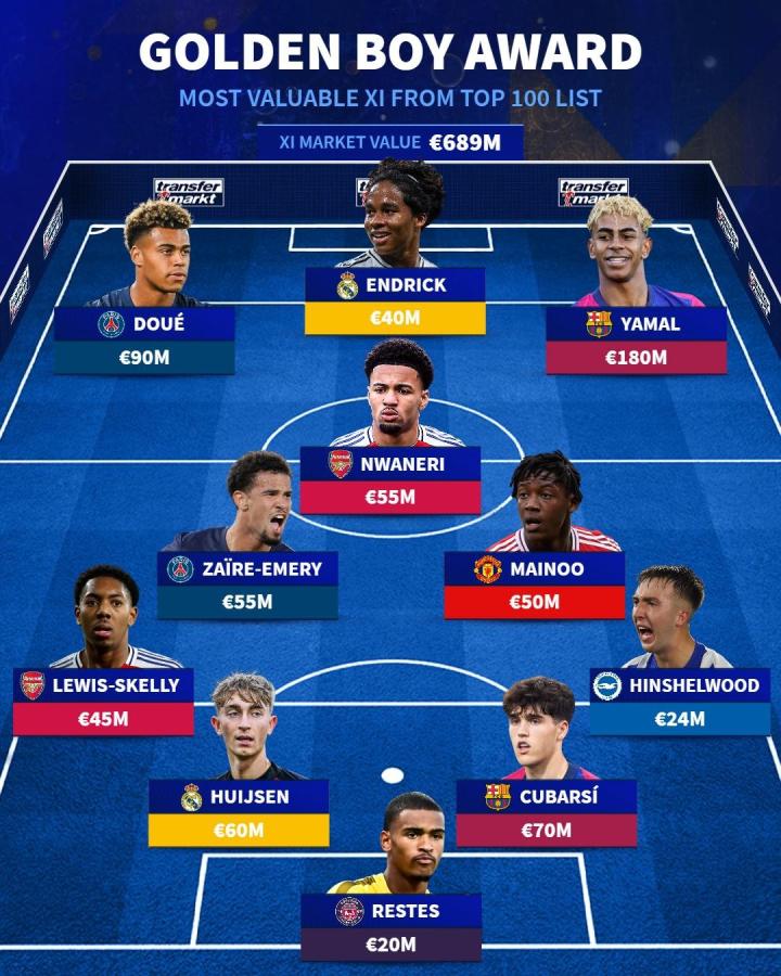 最近,德国转会市场网站列出了一份金童奖候选最贵阵容名单,其中的球员总身价高达6.89亿欧元,引起了广泛关注。这支阵容汇聚了欧洲各大俱乐部的顶级球员,展现了当今足坛新生代的风采。