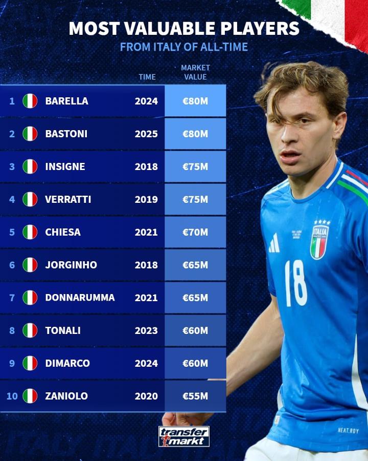 在这份榜单中,巴雷拉以8000万欧元的身价位居榜首,2024年的转会将他的身价推至巅峰。紧随其后的是巴斯托尼,同样身价为8000万欧元,在2025年的转会中引起了不小的轰动。这两名球员的高身价也反映了意大利足球市场的活力和竞争力。